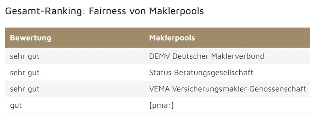 Im Vergleich zu den Versicherern schneiden die untersuchten Maklerpools und -verbünde mit den besten Bewertungen ab. Als „sehr gut“ ausgezeichnet sind hier DEMV Deutscher Maklerverbund, Status Beratungsgesellschaft und Vema Versicherungsmakler Genossenschaft.