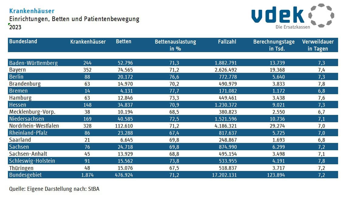 Krankenhäuser nach Bundesländern, Bettenzahl, Auslastung, Fallzahlen und mehr (Quelle: VDEK)