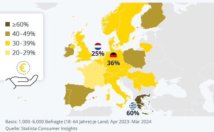 Gut ein Drittel der Menschen in Deutschland macht sich laut Statista Consumer Insights Sorgen um die eigene finanzielle Zukunft. Auch in anderen Ländern Europas treibt die Leute dieses Thema um – vor allem in Griechenland.
