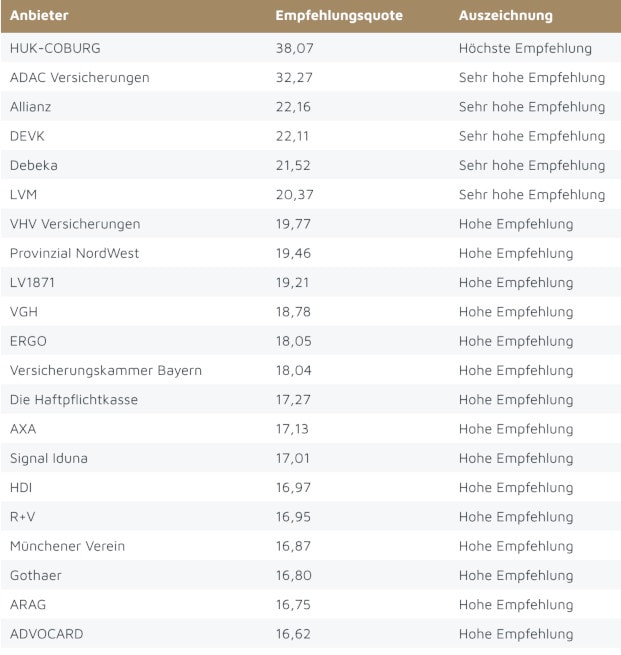 Über die „höchste“ Empfehlungsquote darf sich die Huk-Coburg freuen, auf den Plätzen dahinter folgen mit „sehr hohen“ Empfehlungsquoten die Anbieter ADAC Versicherungen, Allianz, DEVK, Debeka und LVM. Weitere 15 Versicherer schnitten mit der Auszeichnung „hohe Empfehlung“ ebenfalls überdurchschnittlich ab.