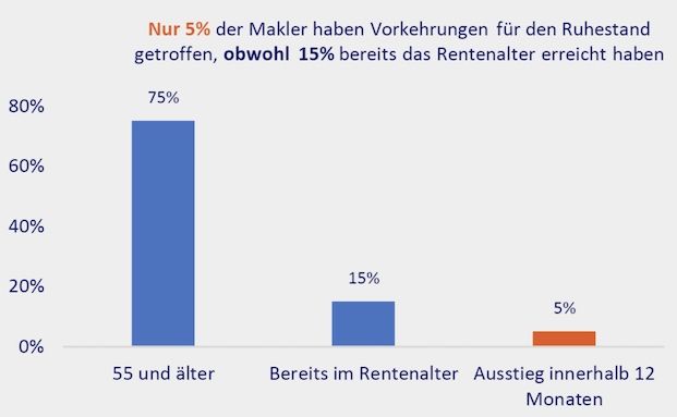 „Dass Zukunftsfragen oft noch nicht geklärt oder noch nicht einmal gestellt sind, ist für uns ein deutliches Alarmzeichen“, so Kanschik. „Denn Zeit ist der entscheidende Faktor, wenn es darum geht, die Nachfolge ordentlich zu regeln.“ 15 Prozent der Teilnehmer des Maklerbarometers hatten zum Zeitpunkt der Umfrage bereits das aktuelle Rentenalter von 65 Jahren erreicht, nur 5 Prozent aber hatten den Ausstieg innerhalb der nächsten zwölf Monate geplant. Kanschik empfiehlt, das Thema mindestens drei Jahre vor dem geplanten Ruhestand anzugehen.