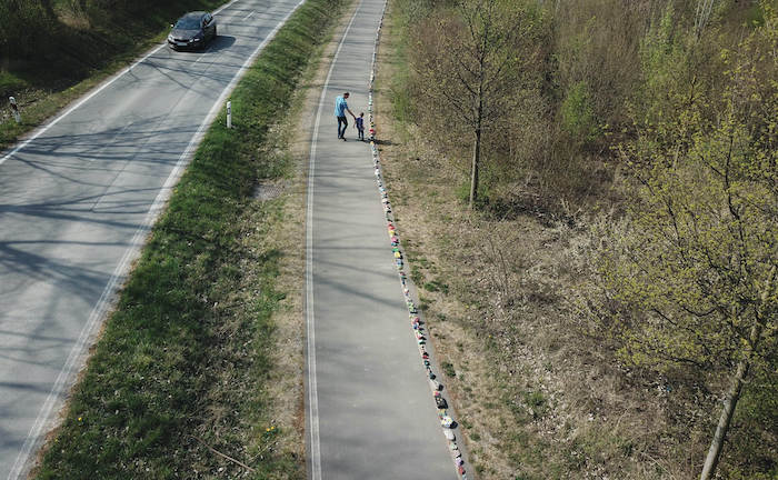 Gemeinsam sind wir stark: Mit bunt bemalten Steinen an vielen Orten Deutschlands verleihen die Bürger ihrer Hoffnung nach Zusammenhalt Ausdruck. Der vierjährige Emil und sein Vater gehen hier am 18. April 2020 in Thüringen an von Kindern bemalten Steinen entlang, die die Ortschaften Azmannsdorf und Linderbach symbolisch miteinander verbinden.
