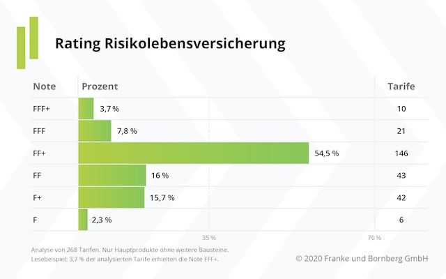 Mit 146 Tarifen sei die Note FF+ am häufigsten vergeben worden. Das Leistungsniveau im Markt sei also gut, biete aber auch noch Entwicklungspotenziale. Bislang stehe die Risikolebensversicherung noch zu selten im Fokus der Produktentwickler, lautet ein Kritikpunkt des Analysehauses. Bei Biometrie-Versicherern friste sie oft ihr Dasein im Schatten der BU-Produkte.