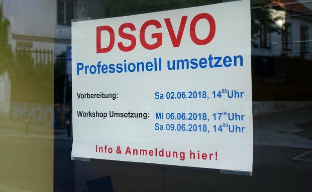 Ein Schaufensterschild wirbt für die Umsetzung der neuen Datenschutzgrundverordnung.