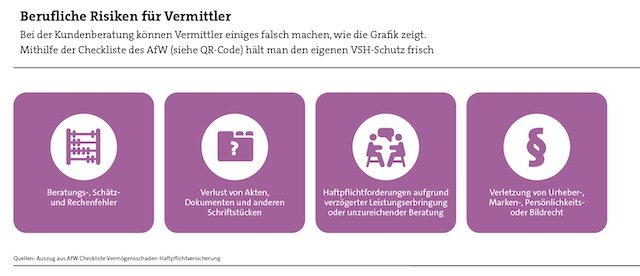 Der VSH-Schutz sollte ohnehin mindestens einmal jährlich gecheckt werden, unterstreicht AfW-Vorstand Wirth. Und: „Bei sämtlichen Änderungen Ihres Risikos sollten Sie überprüfen, ob hierfür überhaupt und in angemessener Höhe Versicherungsschutz besteht. Wir raten: Beraten Sie nur zu Produkten und vermitteln diese, wenn auch der entsprechende VSH-Schutz vorhanden ist.“