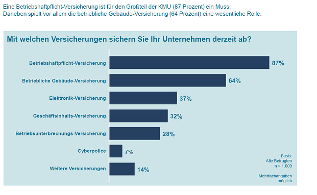 Die Studie zeigt auch, dass der Umfang der Risikoabsicherung mit der Größe der Betriebe steigt: Deutlich mehr Versicherungen, nämlich mehr als sechs, sind bei 31 Prozent der größeren Unternehmen (mit 201 bis 500 Mitarbeitern) zu finden. 40 Prozent besitzen zwischen vier und sechs Verträgen mit Versicherungsunternehmen.