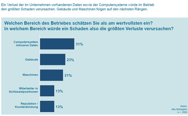 Den größten Schaden würden Probleme an Computersystemen inklusive des Verlusts der Daten verursachen. Das glauben 31 Prozent der Firmen. Auch die Gebäude (23 Prozent) und die Maschinen (21 Prozent) sehen sie als sehr wertvoll an. Weniger relevant seien Mitarbeiter in Schlüsselpositionen sowie die Reputation beziehungsweise Kundenbindung (jeweils 13 Prozent).