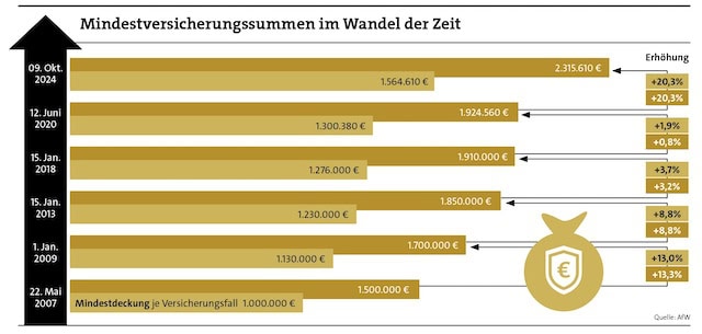 Ab 9. Oktober 2024 wird eine Deckung von 1.564.610 Euro je Versicherungsfall und von 2.315.610 Euro für alle Versicherungsfälle eines Jahres benötigt. Während für Vertreter die Versicherungsgesellschaft, an die sie gebunden sind, die Haftung übernimmt, müssen Makler und Versicherungsberater sich selbst um eine VSH-Police für ihre Berufstätigkeit kümmern.