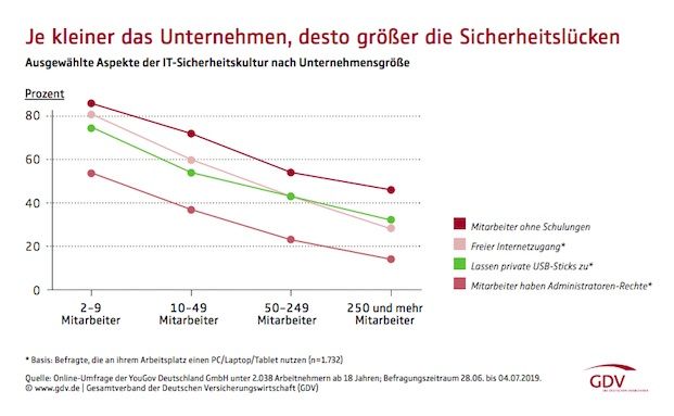 Je größer ein Unternehmen, desto mehr Wert legt es auch auf organisatorische Schutzmaßnahmen im Netz. Das bedeutet laut GDV aber nicht, dass größere Unternehmen keine Sicherheitslücken aufweisen. Ein Beispiel: Von den Mitarbeitern, die in einem Großunternehmen arbeiten und Zugang zu Rechnern haben, dürfen ein Drittel (32 Prozent) an diesen Rechnern auch private USB-Sticks nutzen.