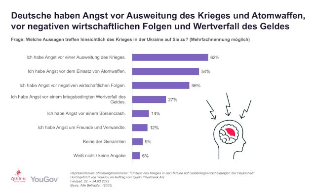 Konkret befürchten die meisten Befragten, eine Ausweitung des Krieges (62 Prozent), Einsatz von Atomwaffen (54 Prozent) sowie negative wirtschaftliche Folgen (46 Prozent). Jeder vierte Befragte (26 Prozent) gibt zudem an, dass sein persönliches Geldanlageverhalten durch den Krieg in der Ukraine beeinflusst wurde.