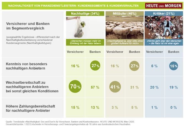 Zu diesem Ergebnis kommt die repräsentative Studie „Nachhaltigkeit: Dos und Dont’s für Versicherer, Banken und Krankenkassen“ des Marktforschungsunternehmens „Heute und Morgen“.