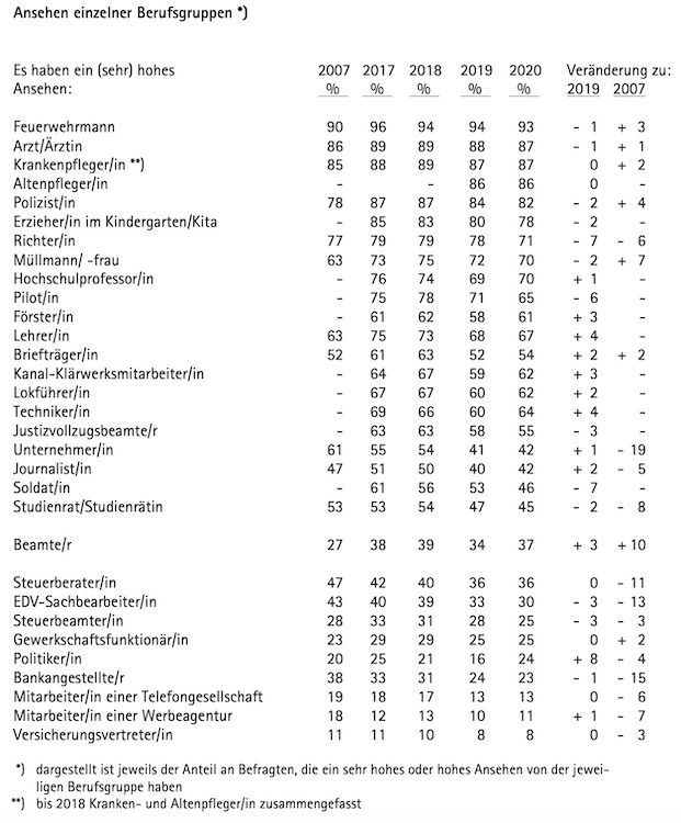 Deutliche Rückgänge im Ansehen seit der Erstbefragung im Jahr 2007 mussten vor allem Unternehmer (minus 19 Prozentpunkte) und Bankangestellte (minus 15 Prozentpunkte) verzeichnen. Über gestiegene Werte dürfen sich seither zuvorderst die Beamten freuen (plus 10 Prozentpunkte), allein gegenüber 2019 verzeichneten die Staatsdiener einen Zuwachs um 3 Prozentpunkte auf nunmehr 37 Prozent. Das reicht zwar nur zu einem Platz im unteren Mittelfeld – was ihnen aber immerhin neun Plätzen Vorsprung gegenüber dem Vertreter verschafft.