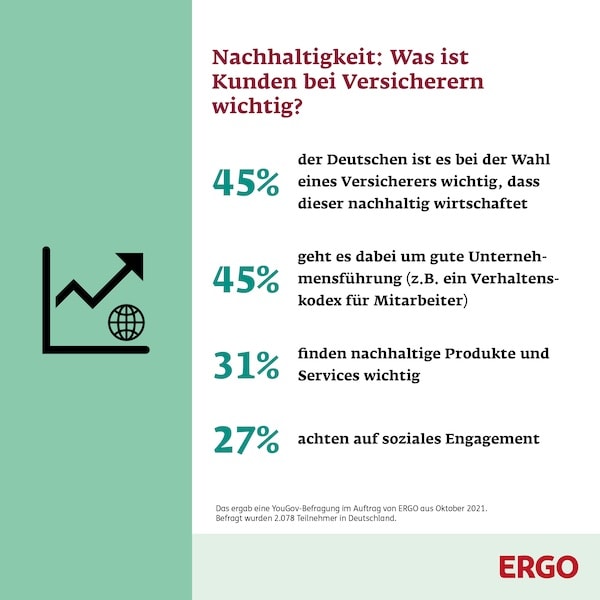 Die Deutschen denken zunehmend nachhaltig – auch bei Finanz- und Versicherungsprodukten. Geht es um die Bewertung eines neuen Versicherers, dann ist es 45 Prozent von ihnen wichtig, dass dieser nachhaltig wirtschaftet. Das hat eine Umfrage des Versicherers Ergo ergeben.
