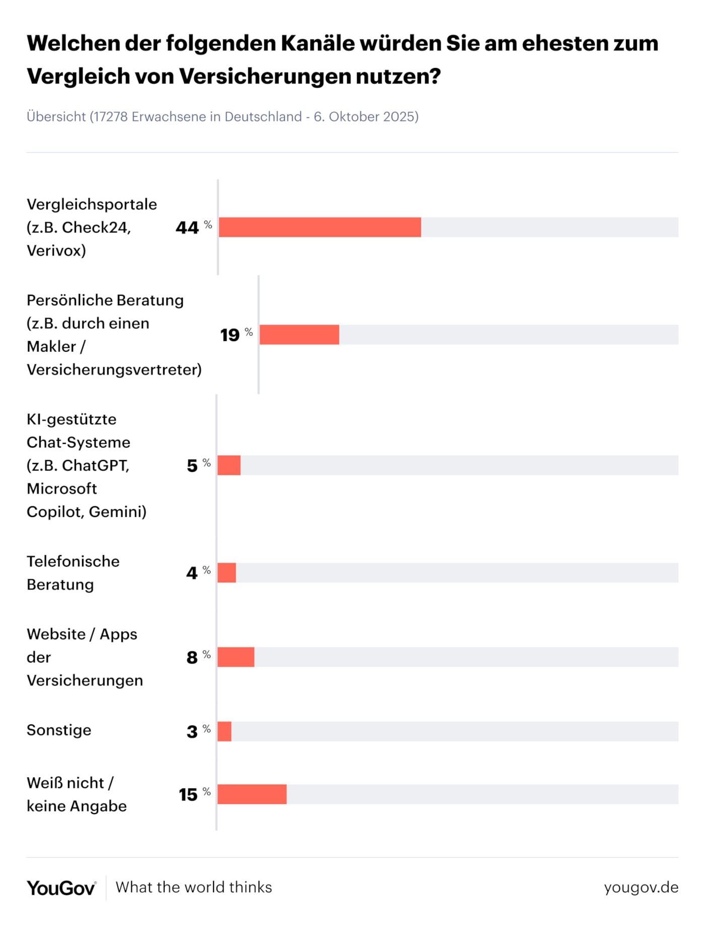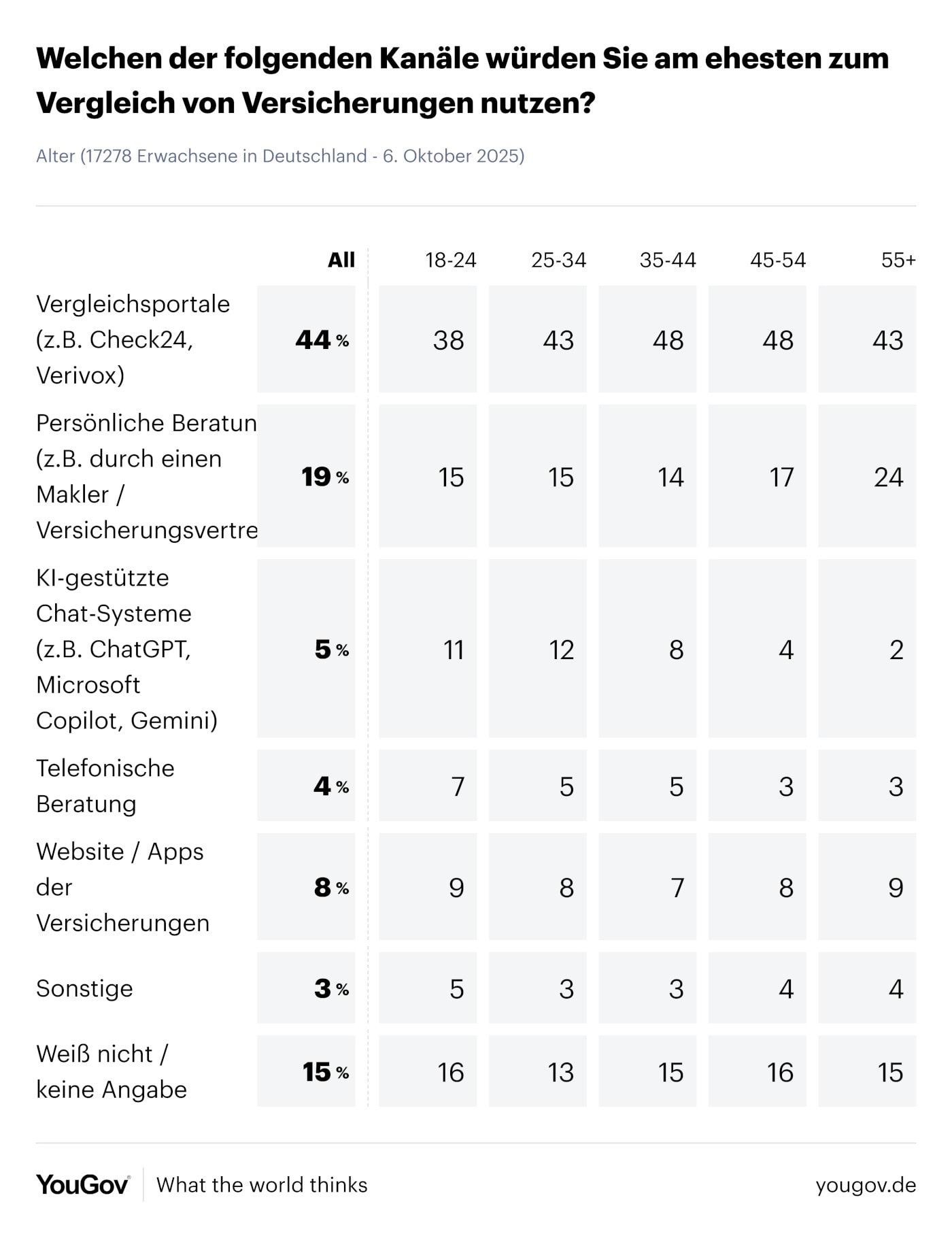 Das Marktforschungsinstitut Yougov wollte in einer aktuellen Umfrage erfahren, wie die Menschen in Deutschland Versicherungen vergleichen. Rang 1 überrascht nicht wirklich: Mit 44 Prozent Zustimmung sind es Vergleichsportale wie Check24 und Verivox (die am Ende digitale Makler sind).