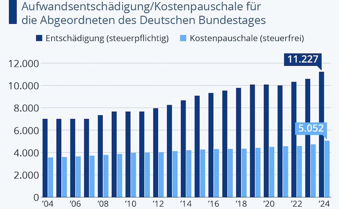 Zum 1. Juli 2024 haben sich die Diäten der Bundestagsabgeordneten um 6 Prozent erhöht. Monatlich bekommen die Politiker nun 11.227 Euro. Zu dieser steuerpflichtigen Aufwandsentschädigung kommt eine steuerfreie Kostenpauschale hinzu, wie die Grafik des Datenportals Statista zeigt.