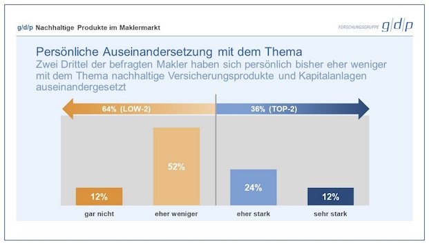 Demnach wünschen sich 43 Prozent der befragten Makler Unterstützung von den Versicherern hinsichtlich nachhaltiger Produkte und Kapitalanlagen, zum Beispiel mittels Webinare. 35 Prozent wünschen sich das nicht. Womöglich finden sich darunter viele Befragte, die dem großen Kreis der Zögerer zuzurechnen sind: So geben 64 Prozent der Teilnehmer an, sich persönlich bisher „eher weniger“ oder „gar nicht“ mit dem Thema nachhaltige Versicherungsprodukte und Kapitalanlagen auseinandergesetzt haben (siehe Grafik).