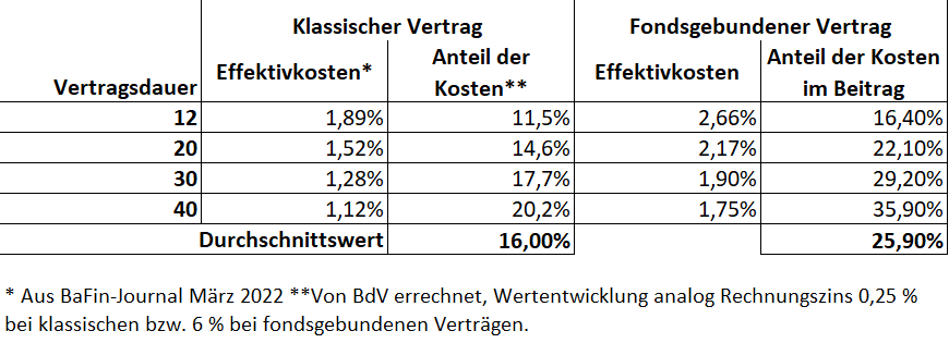 Das ist dem Bund der Versicherten (BdV) aber zu abstrakt. „Effektivkosten von 1,9 Prozent klingen nicht hoch und verbergen, dass tatsächlich knapp ein Drittel der Sparleistung unmittelbar von Kosten aufgefressen werden“, bemängelt Vorstandssprecher Axel Kleinlein. Weshalb der BdV jetzt die Bafin-Beispiele nahm und umrechnete. Er weist die Kosten als Prozentsatz der eingezahlten Beiträge aus. Bei dem erwähnten Beispiel sind es 29,2 Prozent.