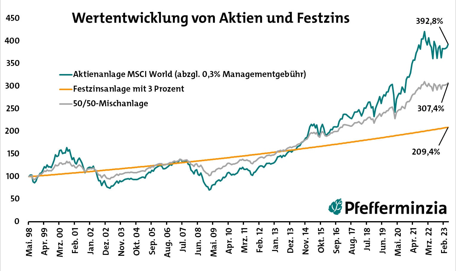 Es ist jedoch auch schon sehr gut zu sehen, wie viel ruhiger schon eine simple Mischung aus Festzins und Aktien verläuft. Natürlich kommt am Ende dafür auch weniger heraus, das ist das Naturgesetz an den Finanzmärkten: weniger Risiko, weniger Rendite. Doch warten Sie mal ab! Die Geschichte hat eine Pointe.