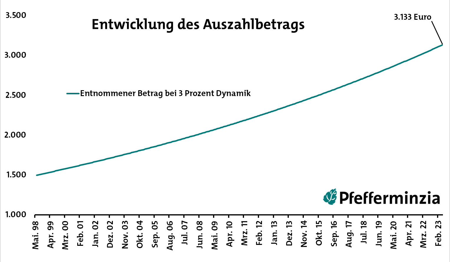 In der zweiten Grafik stellen wir dar, wie sich der monatlich entnommene Betrag entwickelt. Weil sich die veranschlagten 3 Prozent Dynamik ja immer aufs Vorjahr beziehen, entsteht – wie bei Vorsorgebeiträgen auch – eine Exponentialfunktion. Der Graph biegt sich also nach oben. Der Wert wächst immer schneller.