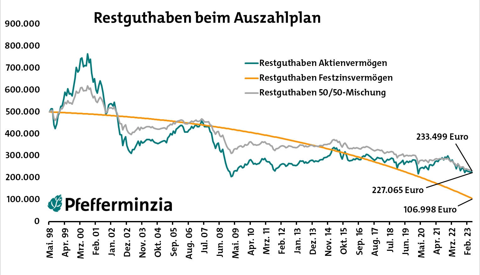 Doch dann kommt die erwähnte Pointe: Obwohl die 50/50-Mischung deutlich weniger Rendite erzielte, liegt das Restguthaben sogar höher als bei der reinen Aktienanlage. Das hängt damit zusammen, dass sie in den Crashphasen deutlich stabiler blieb und somit weniger Fondsanteile für die Auszahlungen verbraucht wurden. Dass es trotzdem keine gute Idee ist, Aktien ganz wegzulassen, zeigt jedoch der Blick auf den Festzinsgraphen. Es kommt immer auf das Maß an.