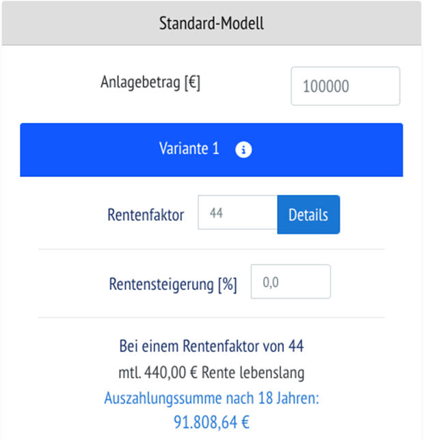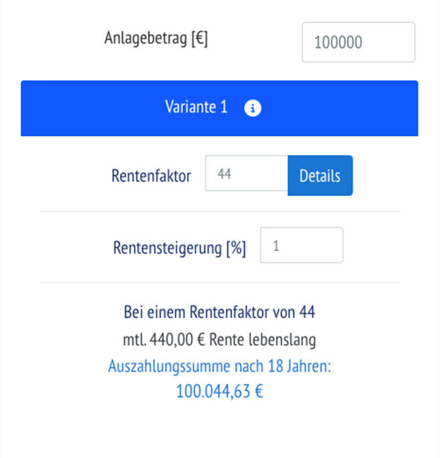 Anlagebetrag 100.000 Euro und den Bestwert, Rentenfaktor 44. Wie aus den oben genannten Quellen zu sehen ist, wird womöglich der reale Fall für den Kunden schlechter aussehen, da hier ein sehr guter Wert verwendet wurde. Bedeutet, der Kunde erhielte 440 Euro monatlich. Lebenslang!