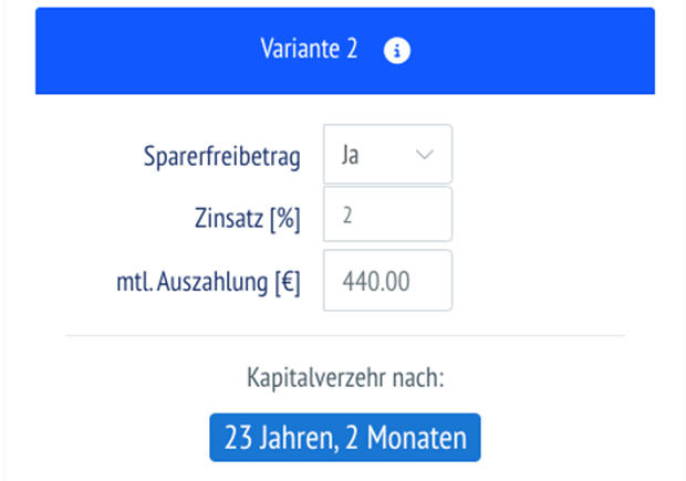 Nehmen wir jedoch 2,0 Prozent Zinsertrag im Jahr für diese 100.000 Euro an und nehmen wir auch an, dass der Kunde dafür den Sparerfreibetrag verwendet. Auch hier lässt sich dein Kunde 440 Euro monatlich (also wie bei der Rentenversicherung) auszahlen, das heißt, er entnimmt monatlich diesen Betrag. Zinsen oberhalb des Freibetrags werden mit Abgeltungssteuer belegt. Sein Ausgangskapital wäre in dieser Variante nach 23 Jahren und 2 Monaten verzehrt.