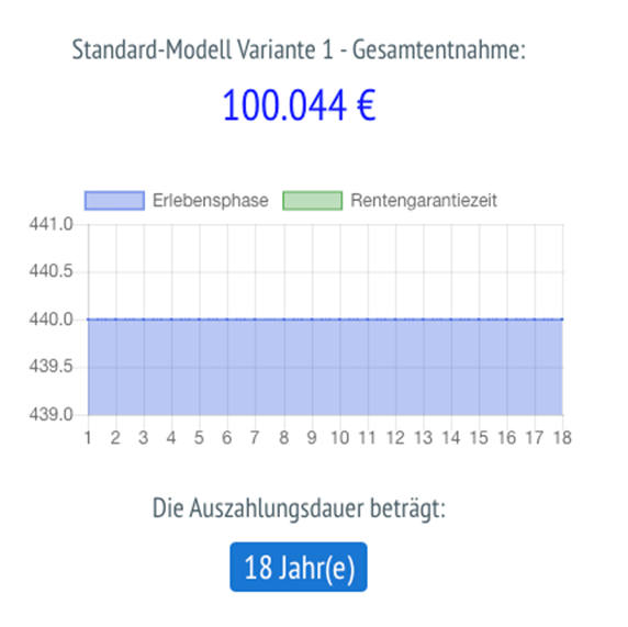 Hier wurden – zum ersten Rechnen – 85 Jahre angenommen. Startet der Kunde mit 67 die sofort beginnende Rente mit monatlich 440 Euro Leistung, dann würde diese Rente 18 Jahre lang (67+18=85) gezahlt werden.