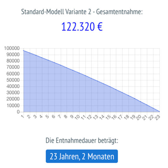 Bedeutet: Im Vergleich zur Rentenversicherungs-Variante läge die Entnahmedauer um fast 8 Jahre höher und bei der Entnahme von einer verzinslichen Anlage alleine, wäre beim sogenannten Zwei-Konten-Modell die Entnahmezeit immer noch 2,5 Jahre länger.