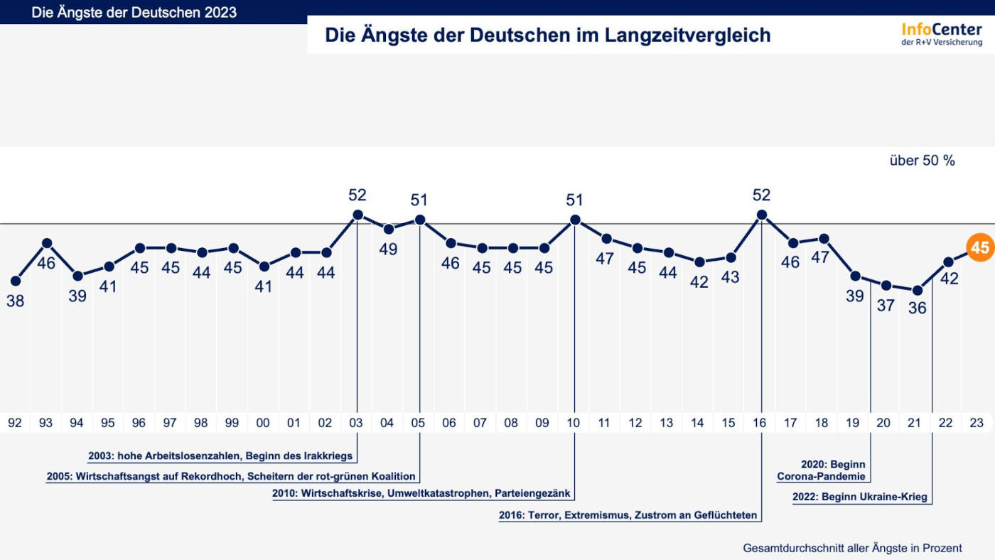 Der durchschnittliche Angstwert über alle Befragten hinweg liegt derzeit bei 45 Prozent. Spitzenwerte von über 50 Prozent gab es beispielsweise 2003, als die Wirtschaft in der Krise steckte und der Irak-Krieg ausbrach, oder auch in weiteren Wirtschaftsschwächen 2005 und 2010. Den niedrigsten Stand erreichte der Index übrigens mit 36 Prozent ausgerechnet 2021, mitten in der Corona-Pandemie und kurz vor dem Ukraine-Krieg.