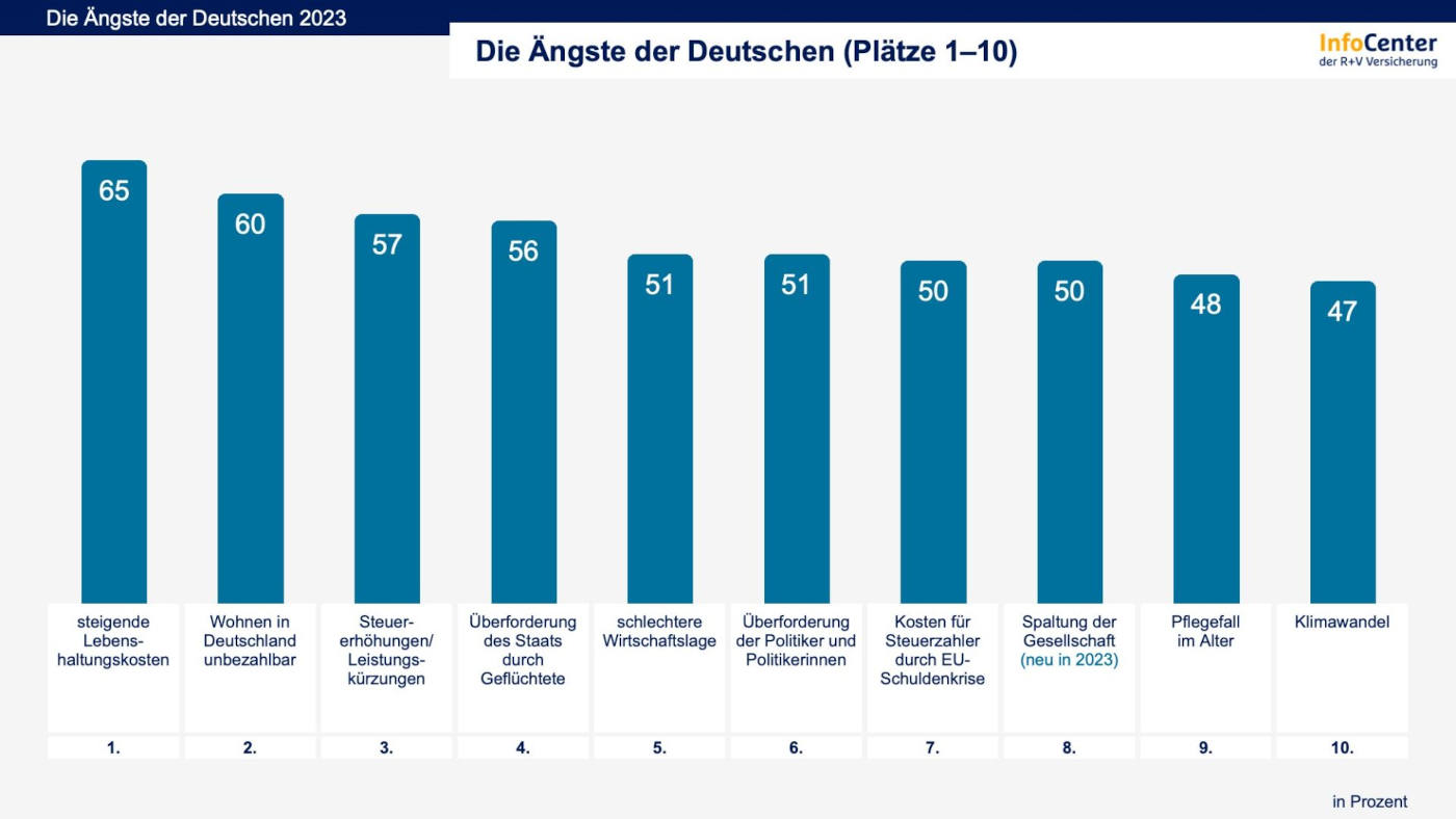 Und was macht den Menschen am meisten Angst? Auch hier lohnt sich der Blick auf Jung und Alt. Fast alle befragten Altersgruppen bereiten vor allem wirtschaftliche Themen Sorgen: Steigende Preise sowie höhere Steuern und gekürzte Leistungen landen unter den Top 3. Nur bei den jüngsten Befragten, den 14- bis 19-Jährigen, stehen Umweltsorgen ganz oben. Auf Platz 1 mit 54 Prozent und deutlichem Abstand die Angst vor dem Klimawandel. Vor Naturkatastrophen fürchten sich 45 Prozent dieser Altersgruppe.