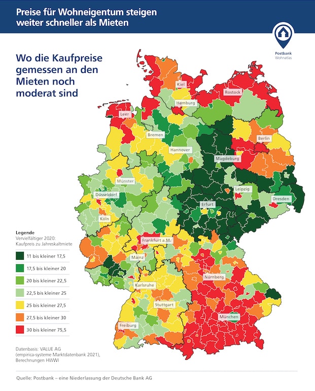 Wer sich eine Immobilie zulegen will, stellt sich meist auch die Frage, ob sich der Kaufpreis im Verhältnis zur Miete lohnt. Ein wichtiger Gradmesser für das Verhältnis von regionalen Kauf- zu Mietpreisen ist der sogenannte Vervielfältiger. Diese Kennzahl bildet ab, wie viele Jahresnettokaltmieten für eine gleich große Eigentumswohnung im Bestand durchschnittlich zu zahlen wären. Laut der Postbank-Studie Wohnatlas 2021 hat sich dieses Verhältnis im Corona-Jahr 2020 weiter zulasten der Kaufwilligen entwickelt (siehe Grafik unten).