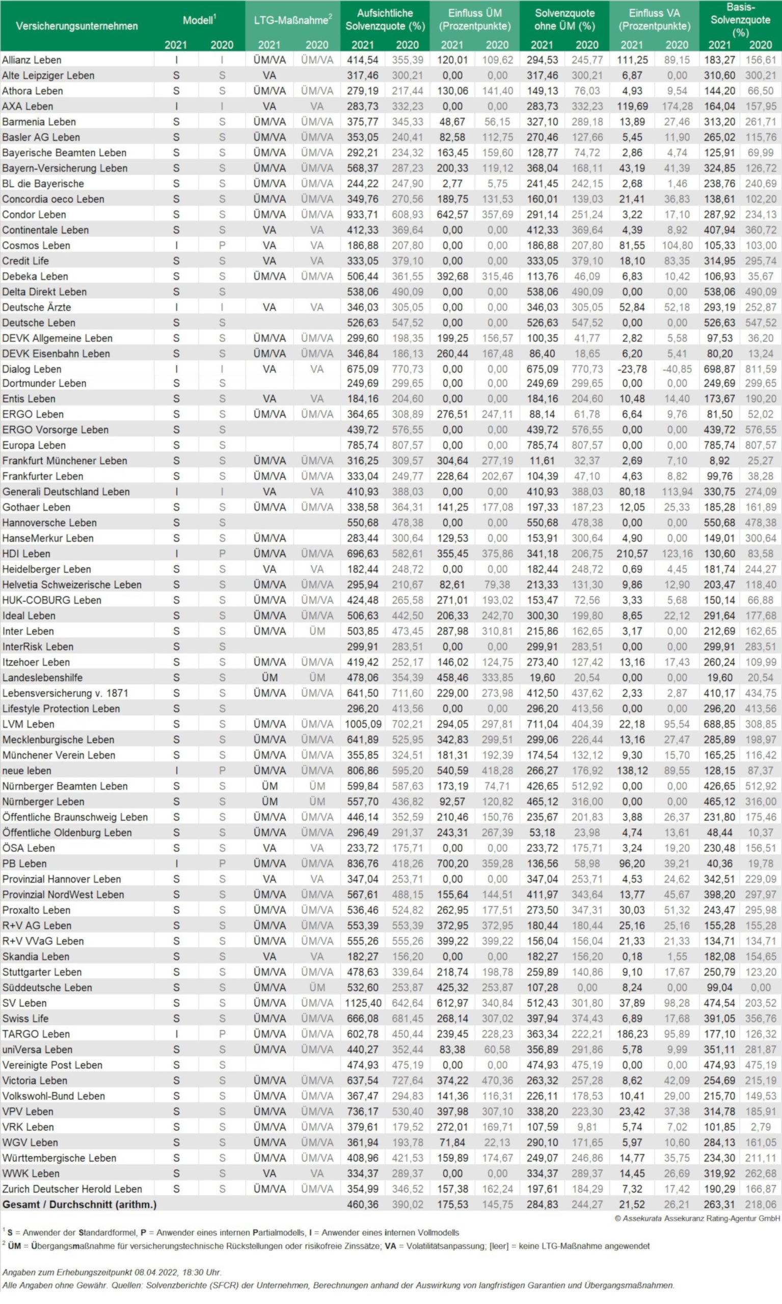 Wie es um die tatsächlichen Solvenzquoten im vergangenen und dem vorausgegangenen Jahr bei 75 Versicherern bestellt ist, zeigt die folgende (ziemlich große) Tabelle mit Stand vom 8. April 2022, 18:30 Uhr. Fortlaufende Daten liefert Assekurata übrigens hier.