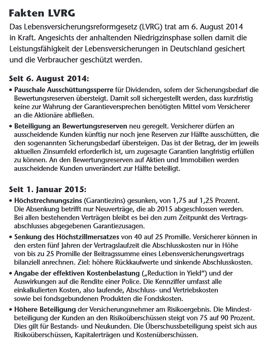 Es war ein politischer Paukenschlag. Mit heißer Nadel gestrickt wurde praktisch über Nacht im Juli 2014 das Lebensversicherungsreformgesetz (LVRG) durch die parlamentarischen Instanzen gepeitscht. Zu akut war die Not der Lebensversicherer, die aufgrund der anhaltenden Niedrigzinsphase in kollektive Schieflage zu geraten drohten. Zu groß die Sorge der Politiker, nicht rechtzeitig eine Vertrauenskrise der Branche verhindert zu haben. Das LVRG soll nun mit einer Reihe von Regeln sowohl die Garantieversprechen in den bestehenden Lebensversicherungsverträgen als auch die Versicherer selbst schützen.