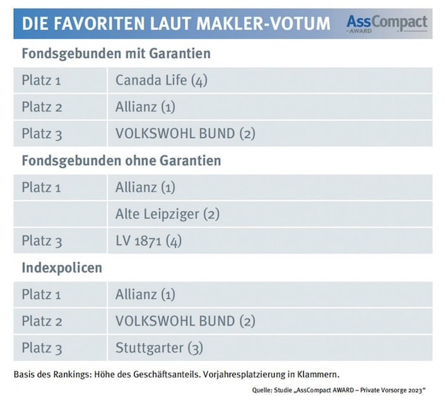 Im Produktbereich der Indexpolicen gibt es dagegen keine Veränderung bei den Spitzenplatzierten. Nach dem Sieger Allianz folgen der Volkswohl Bund auf Rang 2 und die Stuttgarter auf Rang 3.