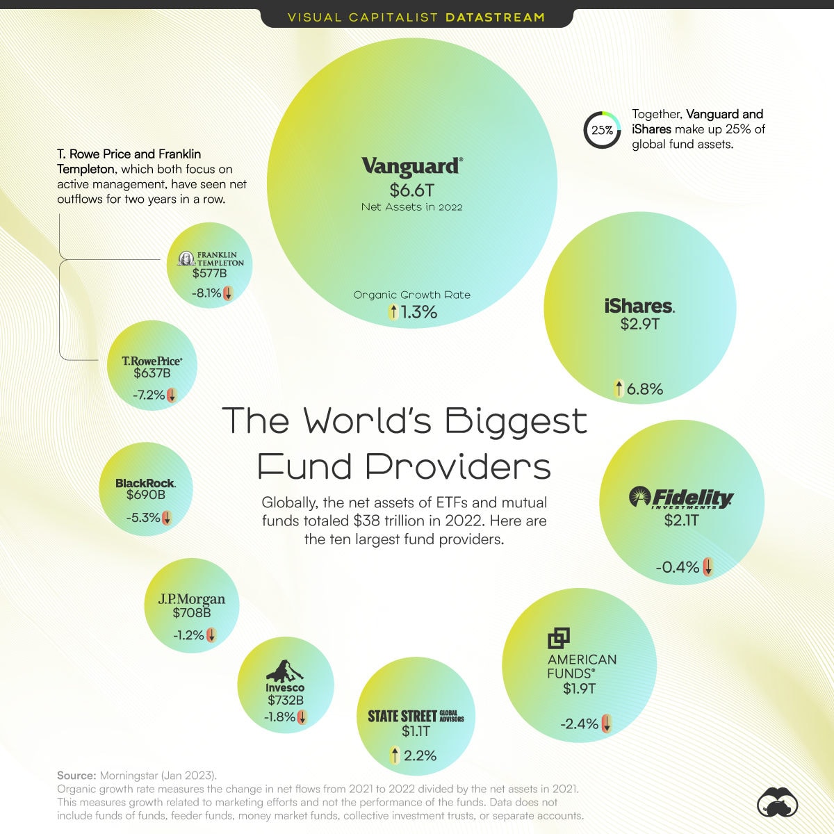 Wobei man hinzufügen muss, dass iShares zum Vermögensverwalter Blackrock gehört. Der landet mit seinen aktiv gemanagten Investmentfonds und 690 Milliarden Dollar auf dem 8. Platz. Eigentlich müsste man also diese Zahlen addieren.