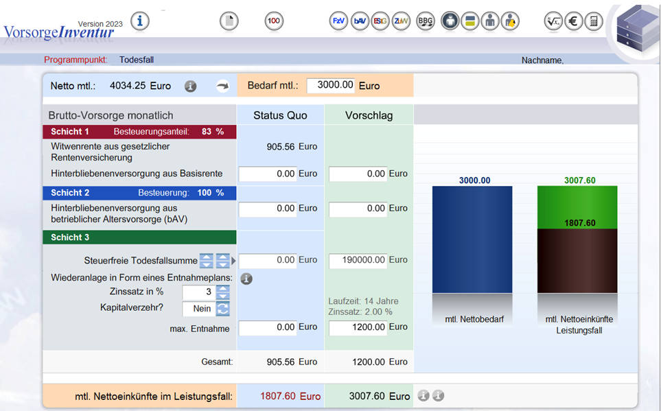 Und schließlich: Berechnung der Netto-Lücke nach Steuern und Ermittlung des Brutto-Kapitalbedarfs zur Sicherung einer gewünschten Versorgungsdauer – so kommt man am Ende auf eine passende Absicherungssumme, die Kunden nachvollziehen, akzeptieren und abschließen können: