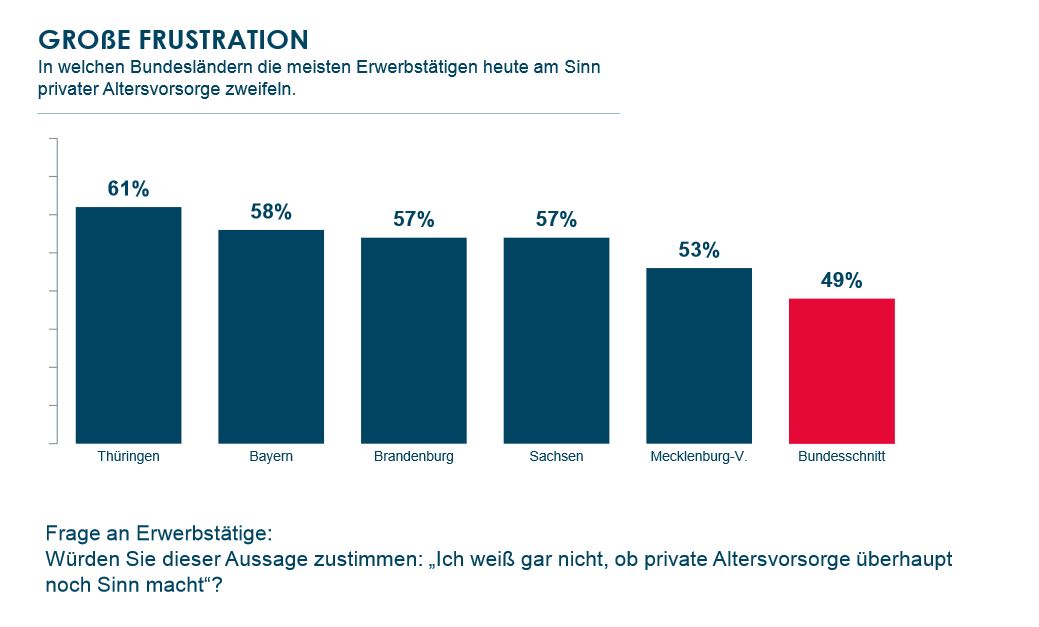 Auf die Frage, welches Fazit Rentner aus ihrer persönlichen Ruhestandsplanung ziehen, sagen 33 Prozent, sie hätten sich zu stark auf die gesetzliche Rente – also den Staat verlassen. In Sachsen und Sachsen-Anhalt sagt das sogar fast die Hälfte der Befragten.