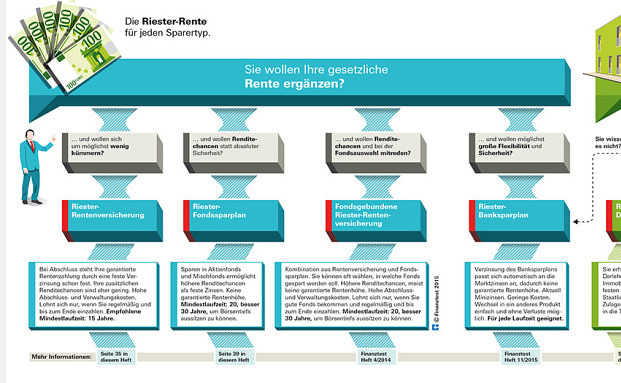 Vier verschiedene Formen der Riester-Rente gibt es: Rentenversicherungen, Fondsparpläne, Banksparpläne und den Wohn-Riester. Viele Kunden stellen sich da wahrscheinlich die Frage: Welche Sparform passt denn jetzt zu meinem Bedarf. Um hier Hilfestellung zu geben, hat die Stiftung Warentest eine Infografik entworfen, die darstellt, welcher Riester zu welchem Kunden passt.