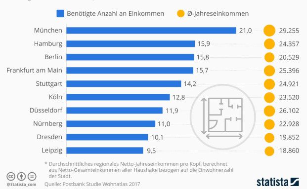Die Immobilienpreise in Deutschland haben in den vergangenen Jahren kräftig angezogen – vor allem in den Großstädten. Wie die Studie Wohnatlas 2017 der Postbank zeigt, ist es für Durchschnittsverdiener in München, Hamburg & Co. dadurch praktisch unmöglich geworden, Wohneigentum aus eigener Tasche zu bezahlen. Wie die Infografik von Statista zeigt, bräuchte man für den Kauf von 100 Quadratmetern Wohnraum in München 21 Mal das durchschnittliche regionale Jahreseinkommen.
