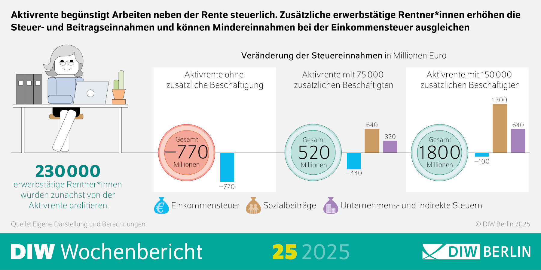 Interessant für Finanzminister Lars Klingbeil von der SPD dürfte auch folgende Rechnung des DIW sein: Ändert sich am Arbeitsverhalten nichts weiter, lässt die Aktivrente die Steuereinnahmen um 770 Millionen Euro im Jahr sinken. Die Gewinnschwelle erreicht der Staat bei 75.000 Rentnern, die zusätzlich arbeiten gehen. Dann sorgen Sozialbeiträge und Steuern für einen Überschuss von 500 Millionen Euro. Nutzen hingegen 150.000 Menschen die Aktivrente, ergäbe sich ein kräftiges Plus von 1,8 Milliarden Euro. Im Jahr.