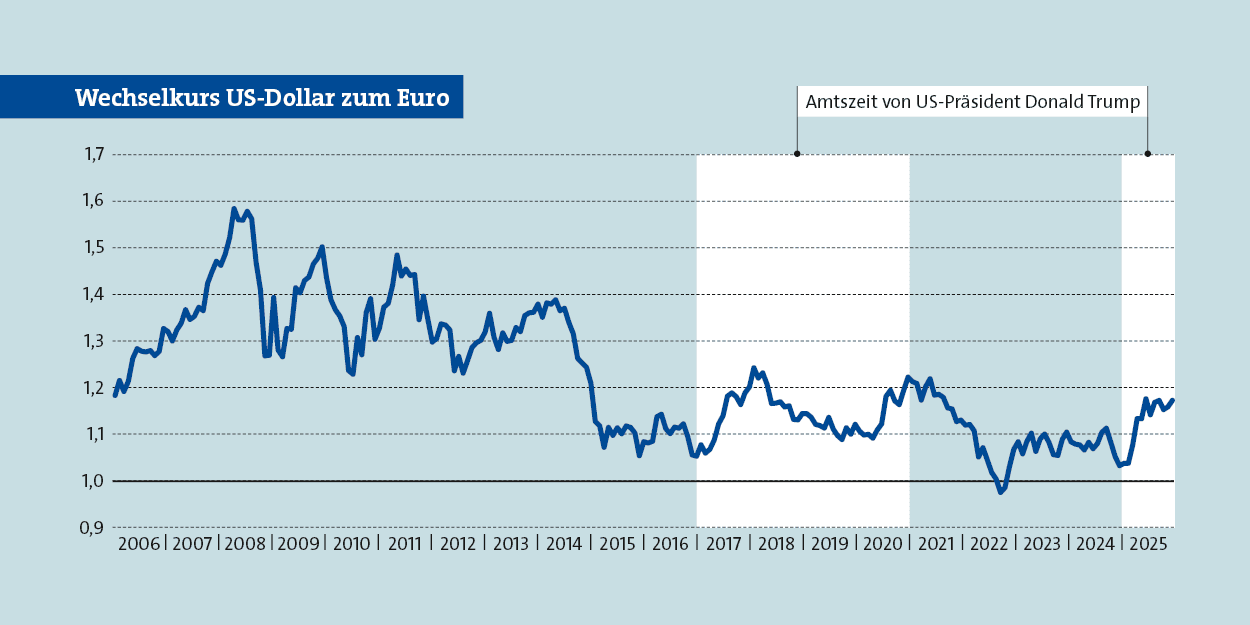 Im Idealfall handelt es sich um kurzfristige Schwankungen und keinen langfristigen Trend. Allerdings erzählen sich die Alten am Feuer auch, dass der Dollar einst in den Achtzigern mal über 3 D-Mark kostete. Das wären heute umgerechnet 1,53 Euro je Dollar beziehungsweise 0,65 US-Cent je Euro. Von so einer Festigkeit hat sich der Dollar wirklich verabschiedet. Auch ohne Trump.