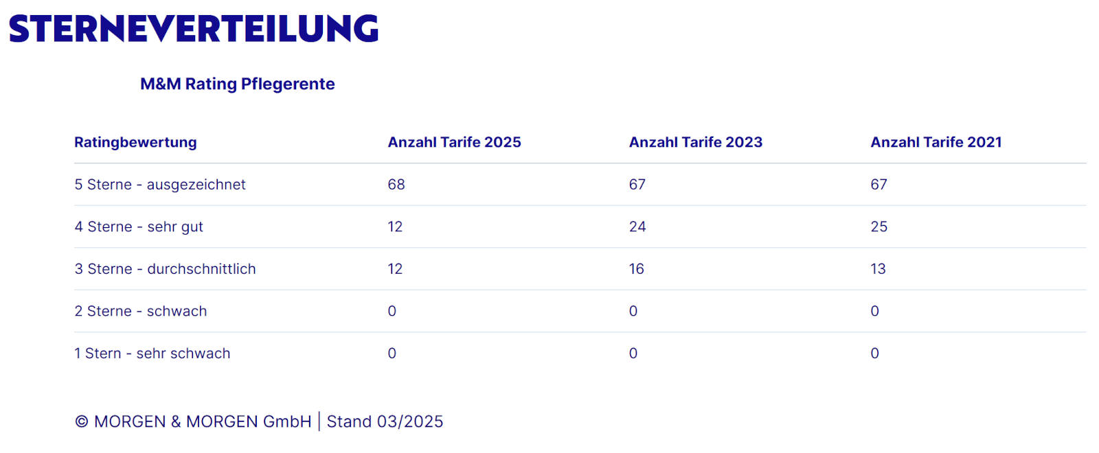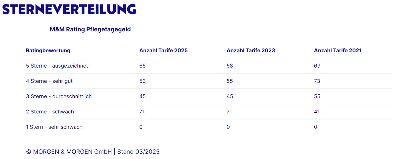 Weiter mit der Pflegerente. Hier zeigen sich die Analysten sicher, dass es sich um ein Auslaufmodell handelt. Denn sie schreiben klar: „Die Pflegerente hat ausgedient. Das Angebot zeigt sich stark rückläufig.“ Während die Zahl der Fünf-Sterne-Tarife ähnlich blieb, halbierte sich das Vier-Sterne-Feld. Hier ist der Sternespiegel.