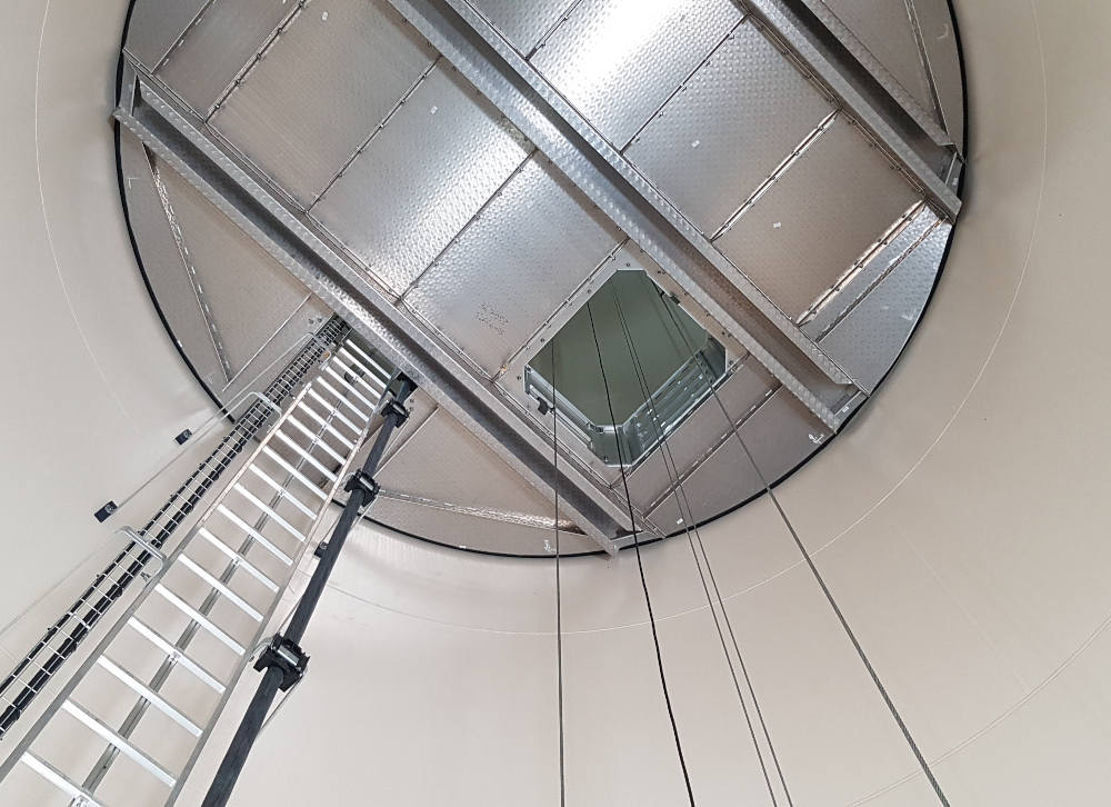 Satte 15 Minuten benötigt der Lift, um uns beide nach oben zu befördern. Oben, das ist in 150 Metern Höhe die Nabe eines Windrads, das in der Gemeinde Akmene in Litauen steht.