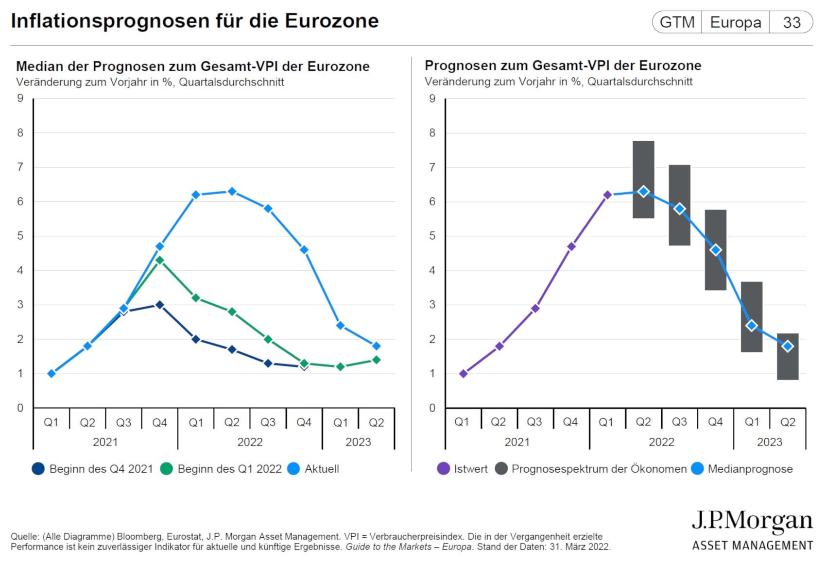 Obwohl Volkswirte ihre Prognosen kräftig nach oben geschraubt haben, erwarten sie demnächst sinkende Inflationsraten. Einige Grafiken aus dem Hause J.P. Morgan Asset Management zeigen, wohin die Reise gehen könnte und was mit dem Leitzins dann passieren würde.