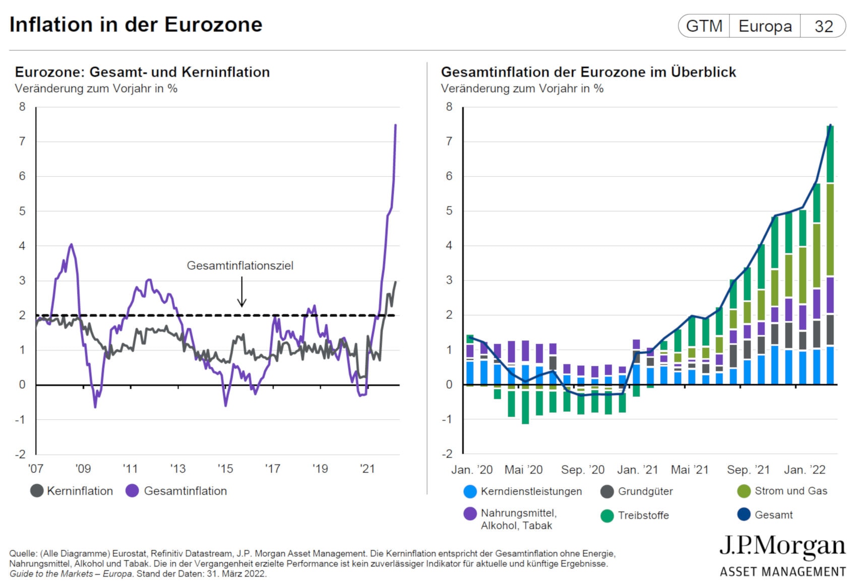 Auf der rechten Seite indes haben die JPMAM-Analysten aufgedröselt, wie sich die Einzelteile der Inflation in den vergangenen zwei Jahren verhalten haben. Dabei fallen vor allem Strom, Gas und Treibstoff auf. Sie bremsten die Inflation erst und geben ihr jetzt den größten Zunder.