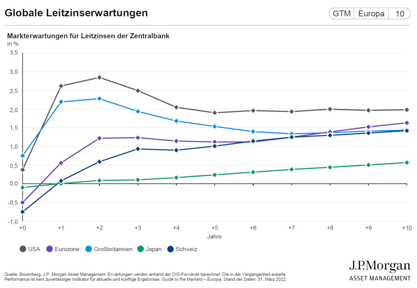 Leitzinsprognose für ausgewählte Zentralbanken (Quellen: Bloomberg, J.P. Morgan Asset Management)