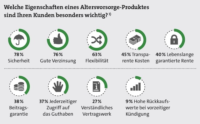 Diese Diskrepanz lässt sich vielleicht damit erklären, dass zwar nahezu 80 Prozent der Umfrageteilnehmer angeben, dass für ihre Kunden Sicherheit ein entscheidendes Merkmal eines attraktiven Altersvorsorgeprodukts ist. Fast ebenso viele nennen jedoch eine „gute Verzinsung“ als wichtiges Kriterium. Und Chancen auf eine gute Verzinsung bieten im Versicherungsbereich derzeit nun mal vor allem garantiefreie Fondspolicen. Eine Beitragsgarantie geben tatsächlich vergleichsweise niedrige 38 Prozent als wichtige Produkteigenschaft an. Höhere Priorität für die Kunden haben Flexibilität und transparente Kosten bei der Altersvorsorge.