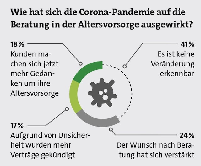 Eine Herausforderung ganz besonderer Art ist die Corona-Pandemie. Das gilt wohl für fast jeden und auch für unsere Leser, die zur Altersvorsorge beraten. 18 Prozent sehen, dass sich ihre Kunden jetzt mehr Gedanken zum Thema Vorsorge machen, und 24 Prozent erfahren einen gestiegenen Bedarf an Beratung. 17 Prozent haben mit Kündigungen zu kämpfen. Aber nicht alle Kunden lassen sich durch das Virus und seine Auswirkungen verunsichern: 4 von 10 Umfrageteilnehmern geben an, dass sie in ihren Kundengesprächen keine Veränderungen verzeichnen.