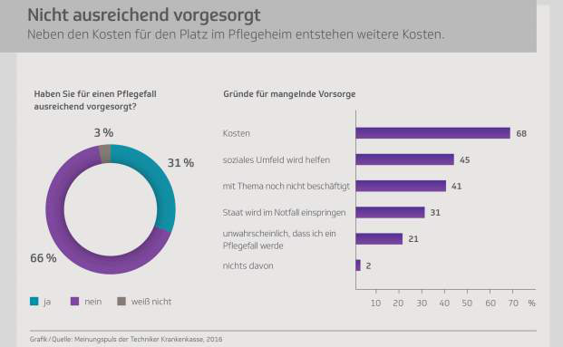 Zwar wissen fast alle Befragten (96 Prozent), dass die gesetzliche Pflegeversicherung nur einen Teil der Kosten deckt. Wie viel ein Heimplatz in der höchsten Pflegestufe tatsächlich durchschnittlich kostet, schätzt aber nur knapp jeder Dritte (32 Prozent) korrekt ein. Im Bundesdurchschnitt kostet ein solcher Platz monatlich rund 3.600 Euro, berichtet die Techniker Krankenkasse. In der aktuell höchsten Pflegestufe III übernimmt die Pflegekasse davon 1.612 Euro, in besonderen Härtefällen bis zu 1.995 Euro. Ab 1. Januar 2017 übernimmt die Pflegeversicherung bis zu 2.005 Euro.
