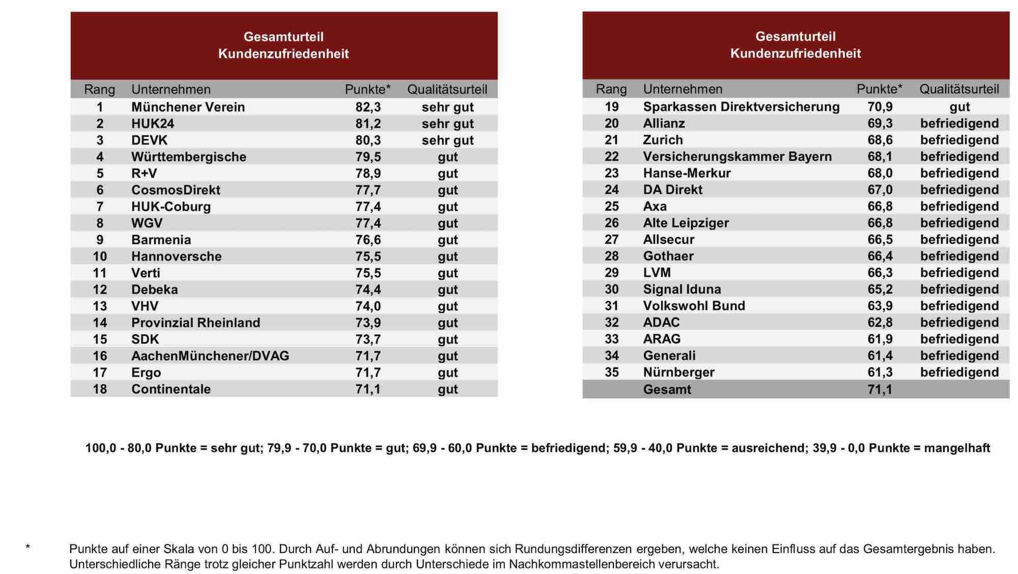 Zudem flossen Kundenärgernisse sowie die Bereitschaft zur Weiterempfehlung in die Gesamtbewertung ein. In der Einzelauswertung wurden alle Unternehmen berücksichtigt, zu denen mindestens 100 Kundenmeinungen eingingen. Das traf auf 35 von 97 bewerteten Versicherern zu.